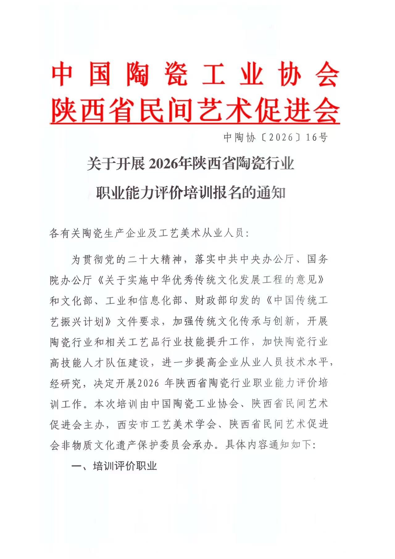 关于开展2026年陕西省陶瓷行业职业能力评价培训报名的通知