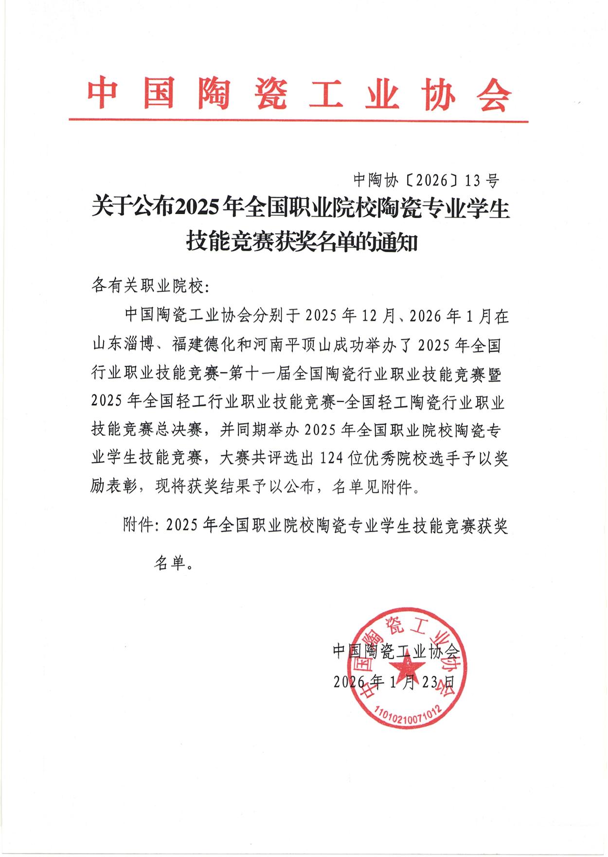 关于公布2025年全国职业院校陶瓷专业学生技能竞赛获奖名单的通知