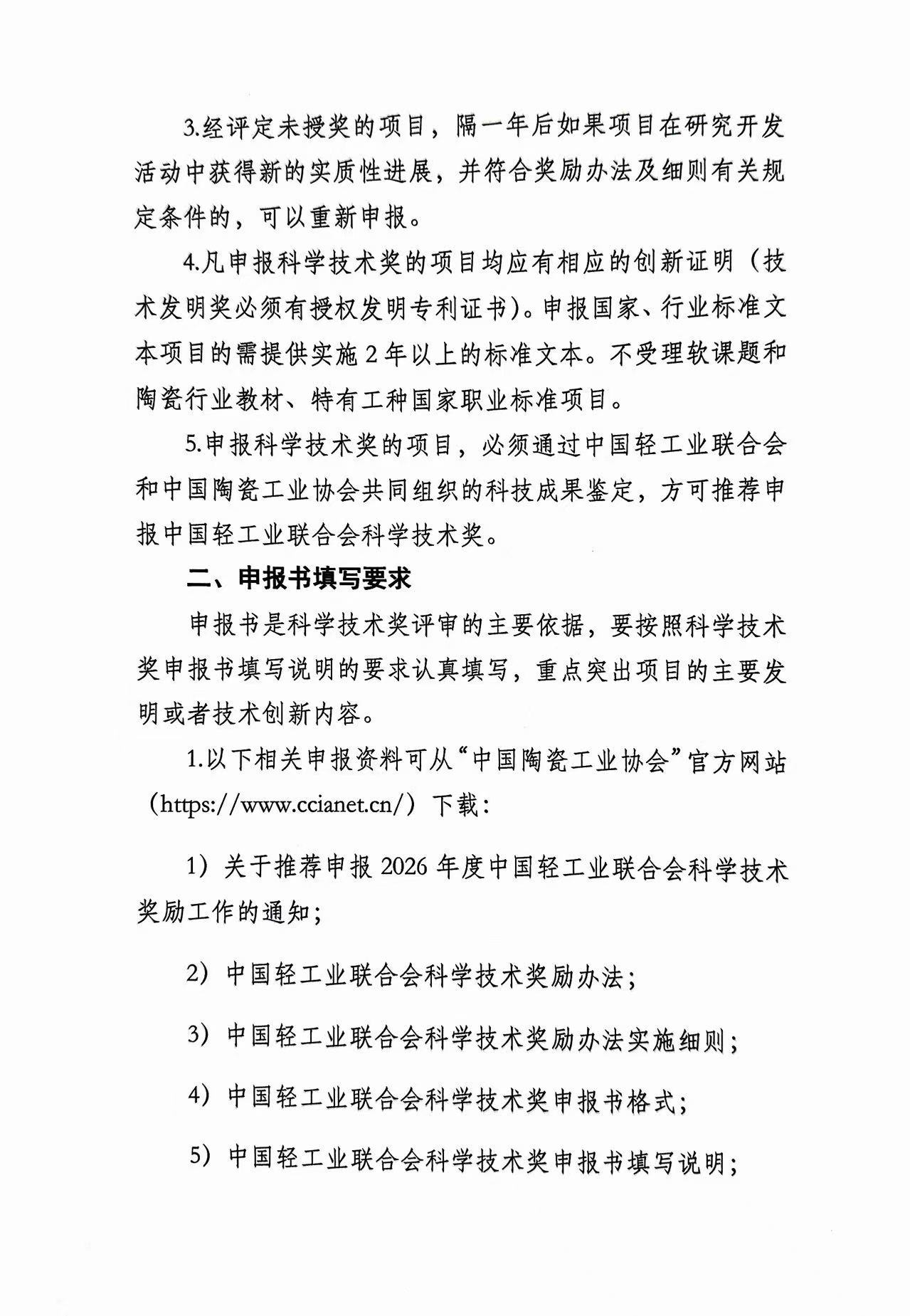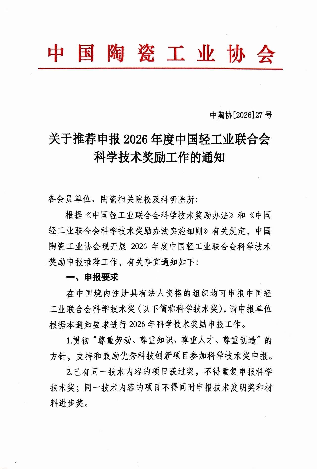 关于推荐申报2026年度中国轻工业联合会科学技术奖励工作的通知